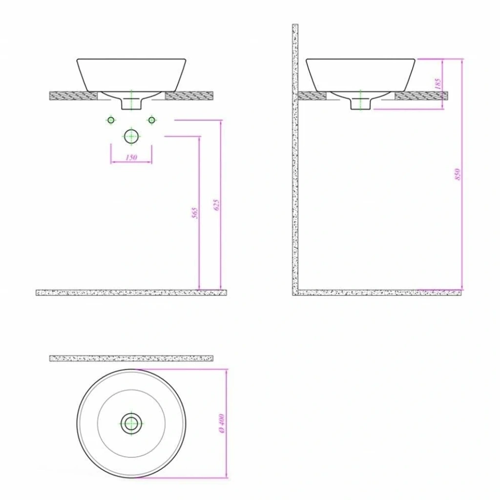 Armatür (Musluk) Deliği:Yoktur. (Lavabonun üzerinde delik bulunmaz. Batarya tezgah üzerine veya duvardan ankastre olarak monte edilmelidir.)
