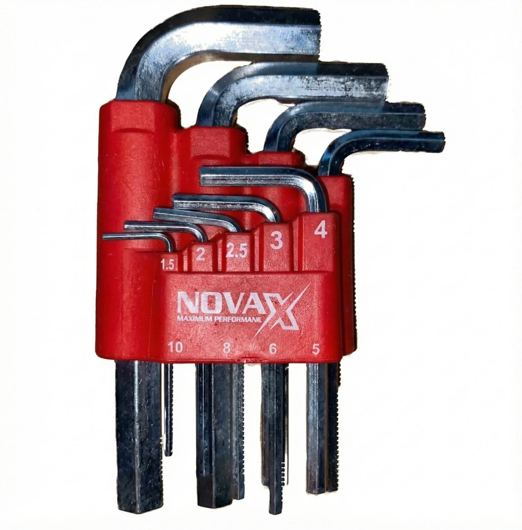 Novax Hex Alyan Anahtar Kısa 9lu Set Yüksek tork dayanımı Özel alaşımlı çelik Korozyana karşı dirençli kaplama Ergonomik tasarımlı plastik klips Allen boyutları 1.5-2-2.5-3-4-5-6-8-10