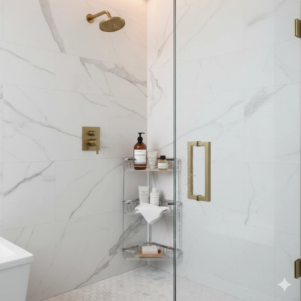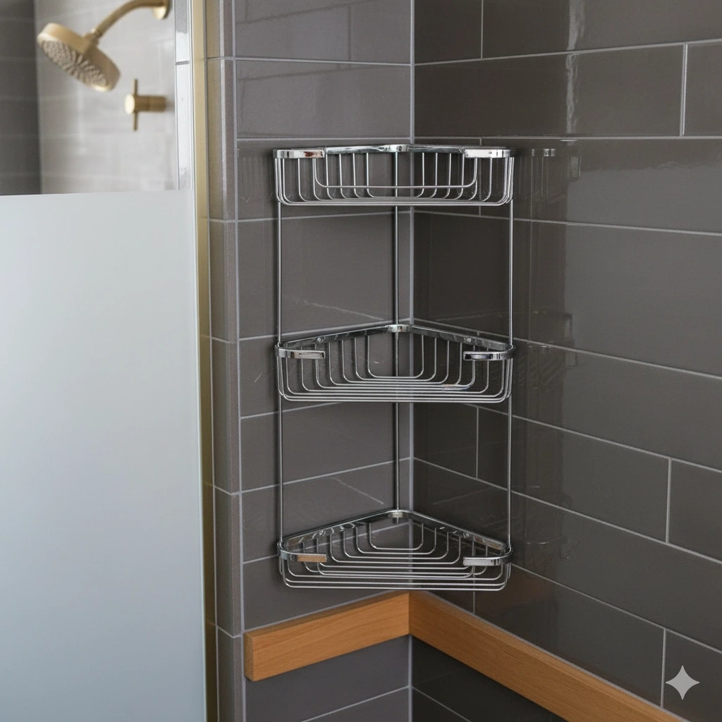 Bu köşe rafı, atıl duran banyo köşelerini verimli bir depolama alanına dönüştürür.