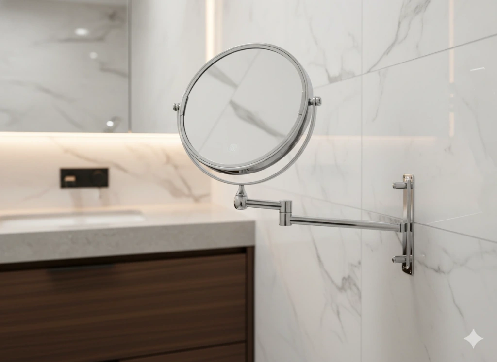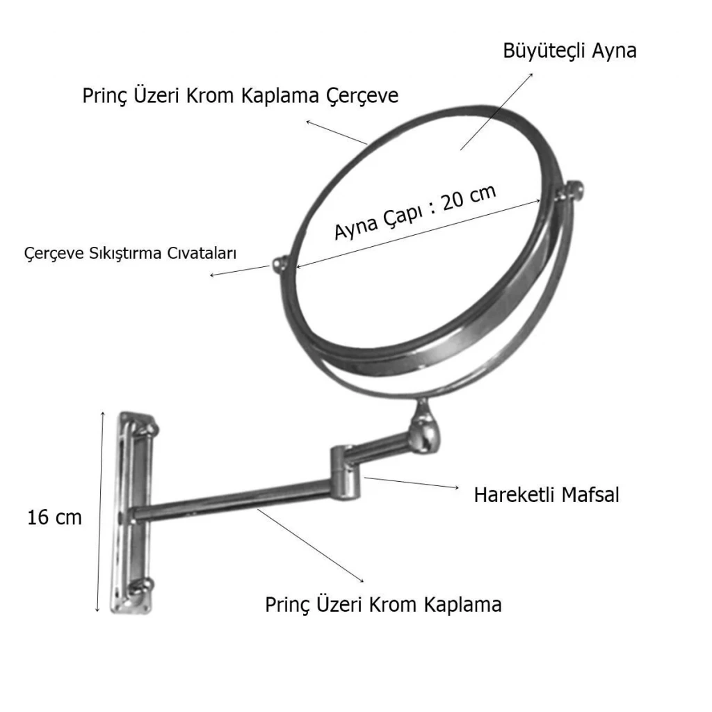 Mafsallı Kol Mekanizması: "Akrobat kol" olarak da bilinen bu özellik, aynanın duvara monte edildiğinde öne-arkaya ve sağa-sola rahatça hareket ettirilebilmesini sağlar. Bu, kullanıcının aynayı en uygun açıda ve mesafede konumlandırmasına olanak tanır. Kullanılmadığında duvara doğru katlanarak yerden tasarruf etme imkanı sunar.